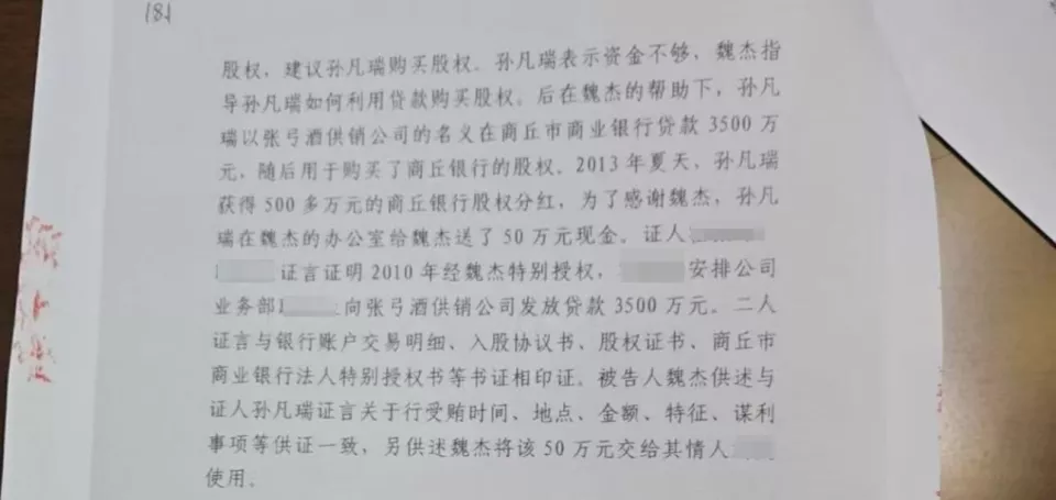 魏杰的生效刑事判决书查明,2010年,商丘市城市信用社要改制为商丘银行并公开向社会出售股权,担任信用社理事长的魏杰,建议张弓酒供销公司老板孙凡瑞购买股权。孙凡瑞称资金不够,魏杰就指导孙凡瑞利用贷款购买股权。后在魏杰的帮助下,2010年12月,孙凡瑞以张弓酒供销公司的名义在商丘银行贷款3500万元,随后用于购买商丘银行的股权。2013年夏天,孙凡瑞获得500多万元的商丘银行股权分红,为了感谢魏杰,孙凡瑞在魏杰的办公室给魏杰送了50万元现金。