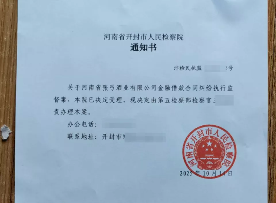 此后,张弓酒业公司以前述理由向开封市检察院申请执行监督。今年10月14日,开封市检察院出具受理通知书,正式受理了此案并分配具体承办检察官。