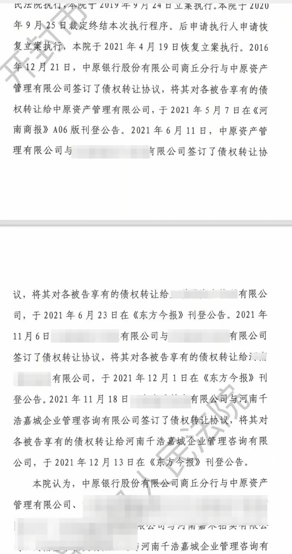 开封市中院的裁定查明,2016年12月21日,中原银行商丘分行与中原资产管理有限公司签订了债权转让协议,将其对各被告享有的债权转让给后者,并于2021年5月7日在报纸刊登公告。2021年6月11日至11月18日,该债权在短时间内又历经了三次转让,最终由河南千浩嘉城企业管理咨询有限公司(下称河南千浩公司)取得。