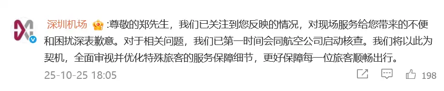 10月25日晚间,深圳机场官方微博在歌手郑智化的评论区留言致歉:尊敬的郑先生,我们已关注到您反映的情况,对现场服务给您带来的不便和困扰深表歉意。对于相关问题,我们已第一时间会同航空公司启动核查。我们将以此为契机,全面审视并优化特殊旅客的服务保障细节,更好保障每一位旅客顺畅出行。