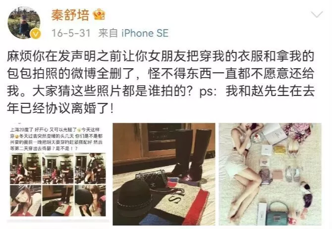 2016年,正当三姐妹的事业全面开花时,港媒意外拍到秦舒培和陈冠希的亲密合照。消息曝光后,赵磊发文斥责秦舒培,秦舒培立即回击,称二人去年早已离婚,并反指他出轨嫩模。