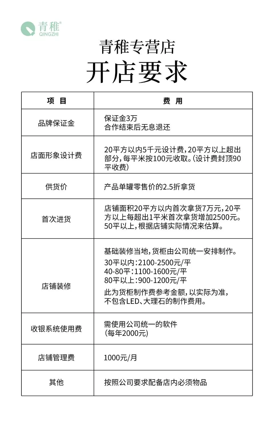 “青稚” 的加盟政策堪称 “低门槛”:不收取加盟费,只要求加盟商支付 3 万元保证金,首次进货金额在 7-10 万元,同时承诺