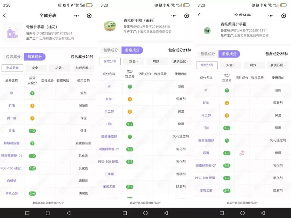 三者唯一差别在于香精、保湿剂添加上,其实可以视为同一产品