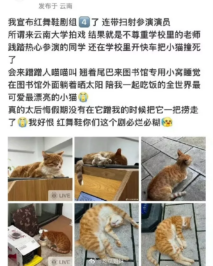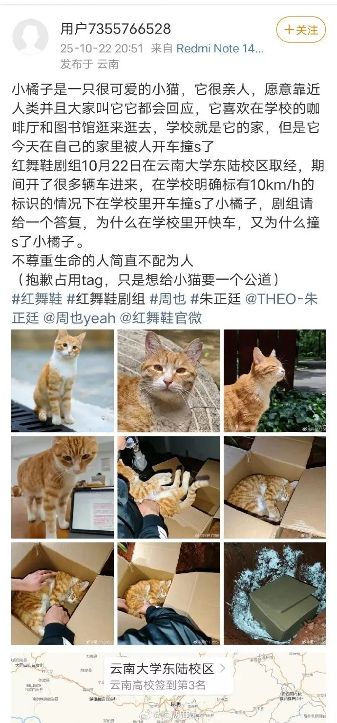 云南大学网红流浪猫“小橘子”因一场拍摄意外丧命,让学生们陷入无尽悲伤。《红舞鞋》剧组22日在校内取景拍摄时,车辆误撞小橘子身亡,引起学生们舆论挞伐。该剧组于隔日凌晨发表道歉声明称,司机“疏忽未察觉车旁小动物”,然而,也有学生质疑,真正原因是剧组车辆在校园内超速行驶,要求学校与警方调查真相。