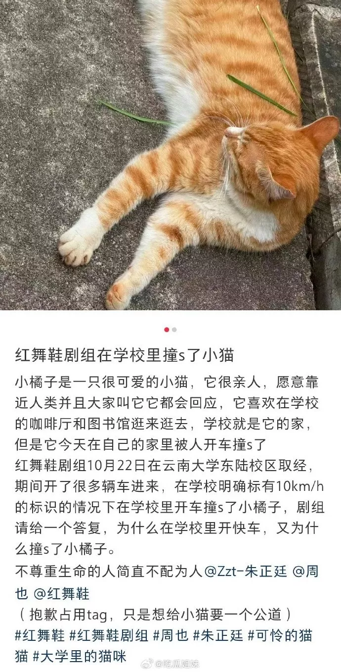 《极目新闻》报导, 10月23日凌晨,《红舞鞋》剧组发佈致歉声明,经反覆沟通与确认,10月22日,《红舞鞋》剧组在云南大学取景拍摄期间,剧组司机因疏忽失误,并未发现有小动物在车辆附近,故而发生意外,导致校园内流浪猫小橘子不幸离世。剧组全体人员对此深感痛心与愧疚,向全校师生及所有关心此事的朋友致以最诚挚的歉意。