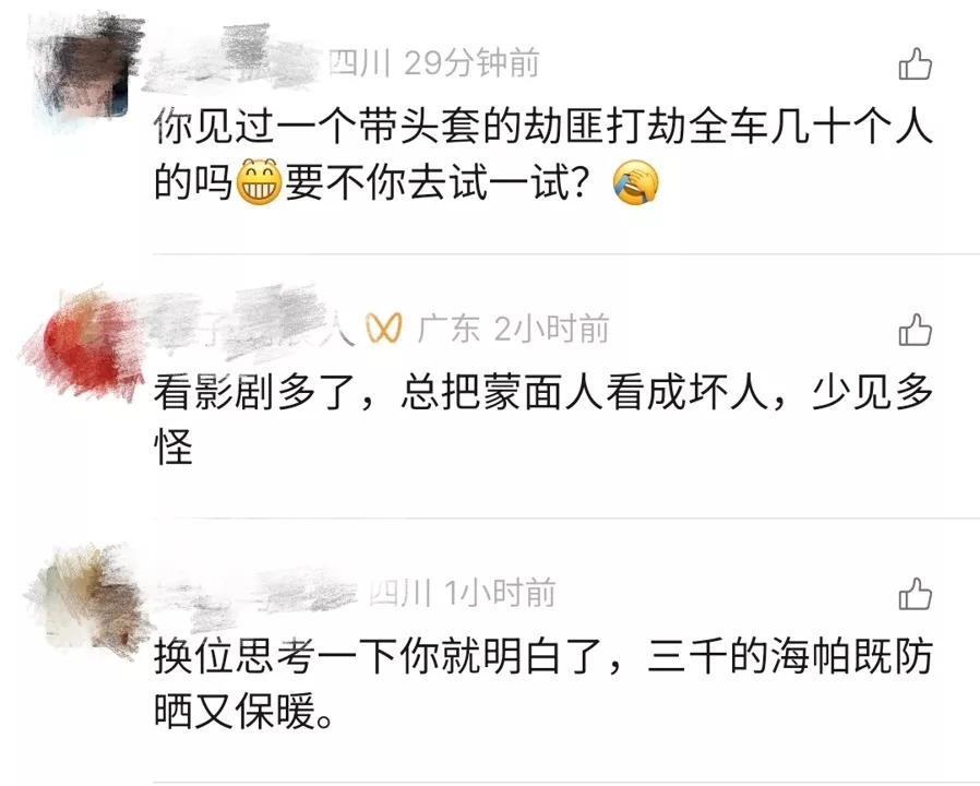 该帖子引发广泛关注和讨论,不少网友调侃司机戴全黑的头罩看起来像劫匪,还有网友打趣称:“甚至能看到人质发帖”“你就说人质这待遇好不好”。还有网友关注司机为什么会戴头罩,部分网友认为是防晒,还一部分网友认为是为了保暖。