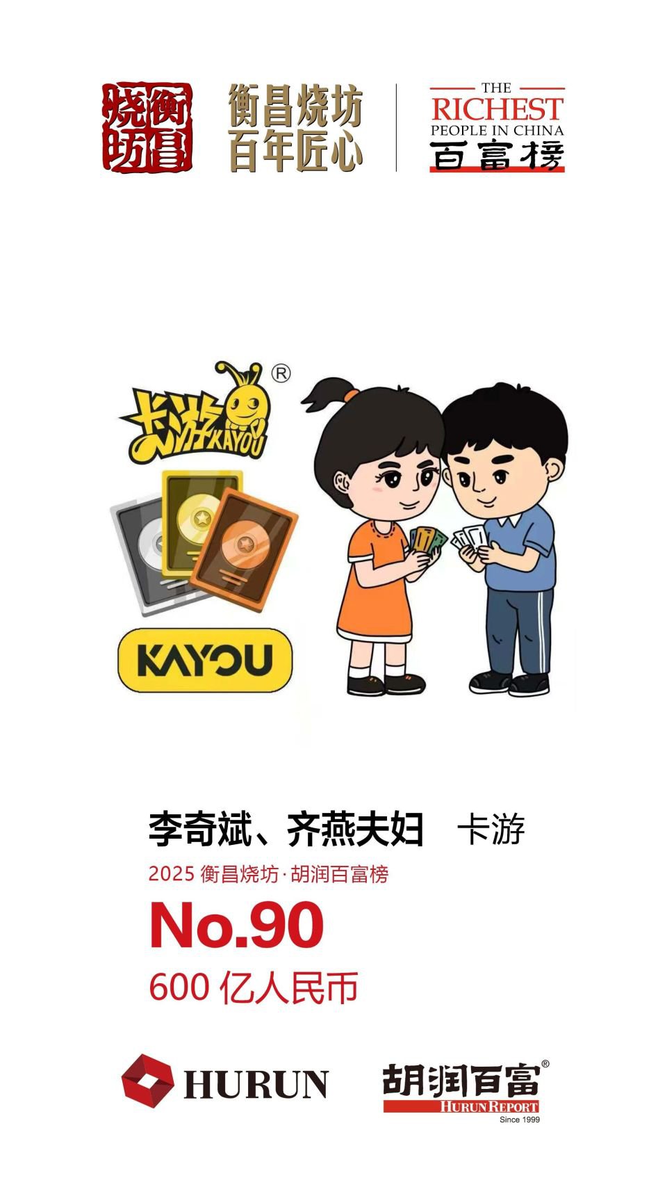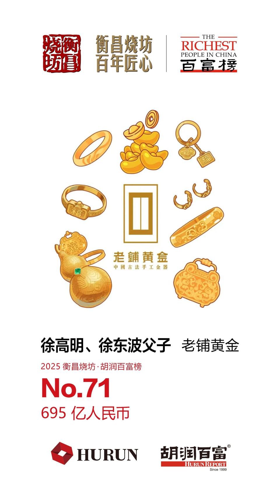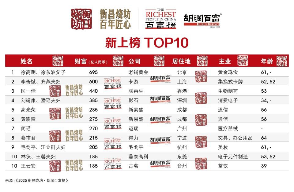 376位新面孔,为去年的7倍。新人之首是老铺黄金的徐高明、徐东波父子,以695亿元财富跻身前100;其次是集换式卡牌龙头卡游的李奇斌、齐燕夫妇,财富600亿元。新人前十还包括智能影像设备企业影石34岁的刘靖康与其妻子潘瑶,财富385亿元。此外,“奶茶”界知名品牌古茗、霸王茶姬和沪上阿姨成功上市,创始人39岁的王云安、30岁的张俊杰和47岁的单卫钧与其妻子周蓉蓉分别以185亿元、135亿元和95亿元财富首次上榜。