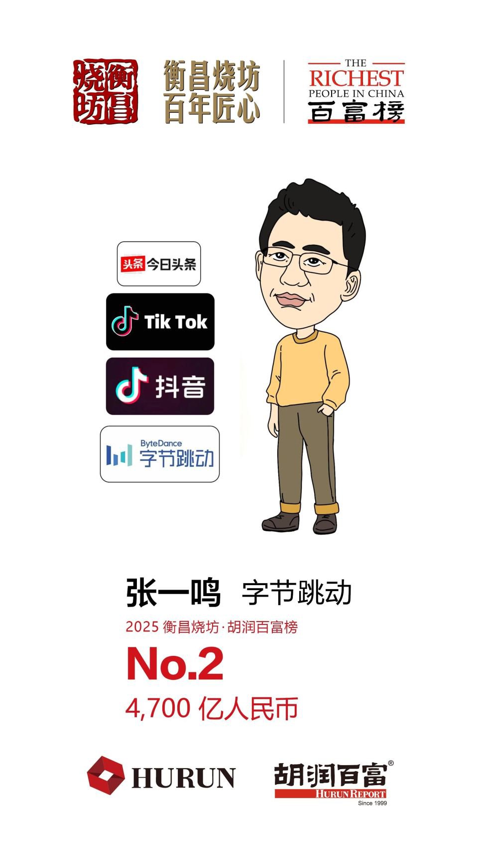42岁的字节跳动创始人张一鸣财富增长1200亿元(+34%),这得益于AI业务进展推动公司估值继续走高,但他仍以4700亿元退居第二,让出去年首富头衔。今年上半年字节跳动营收超6500亿元,同比增25%;中国市场贡献75%,TikTok占海外收入超60%。根据第三方机构QuestMobile的数据,截至2025年8月,字节跳动旗下AI助手“豆包”月活跃用户达到1.57亿,位居国内第一位。据胡润全球独角兽榜,字节跳动是中国第一大独角兽,而全球第一大独角兽是埃隆·马斯克的SpaceX。