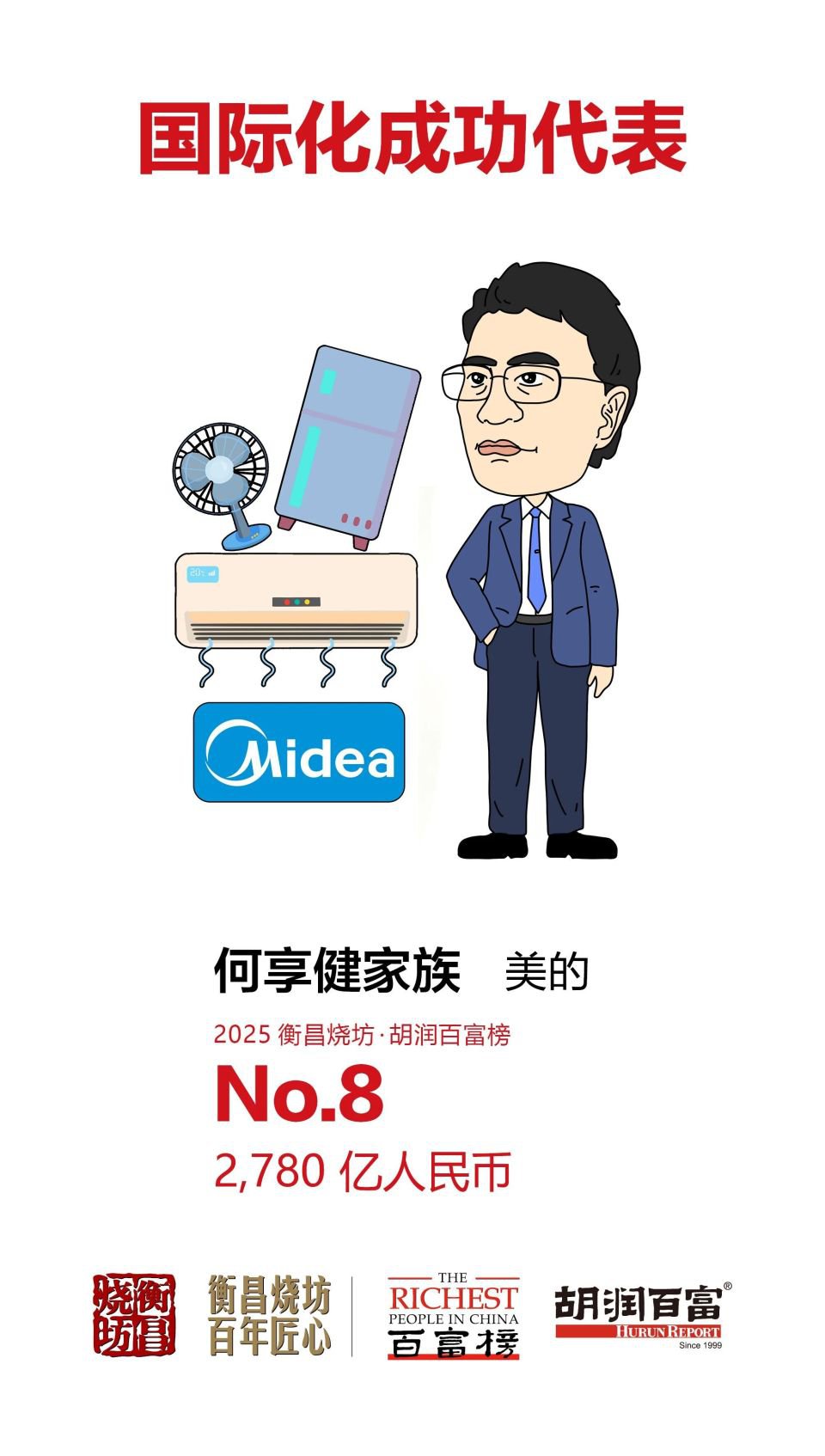 83岁的何享健及其家族财富比去年增长430亿元(+18%),以2780亿元位列第八,下降三位。美的去年业绩再创历史新高,营收4071亿元,同比增长9.4%;归母净利润385亿元,同比增长14%。其中,ToB业务作为“第二引擎”,持续保持高速增长,收入1045亿元。去年,美的完成H股发行,A+H双平台落地,进一步助力全球突破战略。何享健最近一年分红90多亿元。