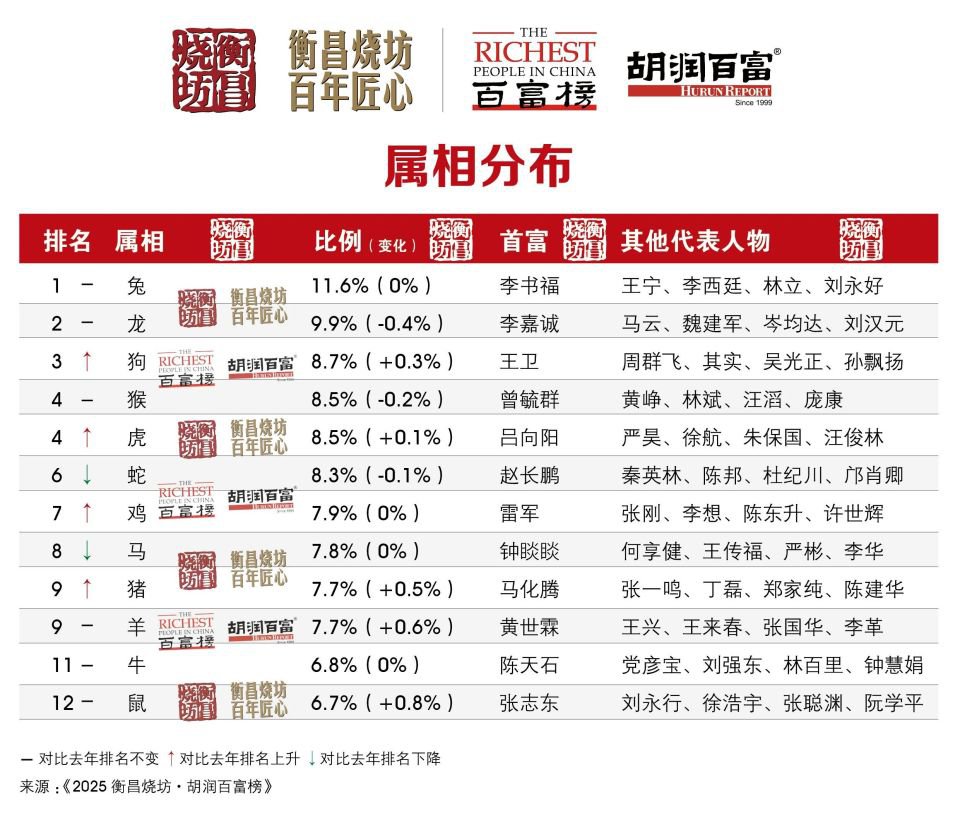 今年上榜人数占比中,鼠是增长最多的生肖,属鼠的企业家包括希音41岁的许仰天、公牛53岁的阮学平;龙则是下降最多的生肖。兔延续强势表现,已连续14年稳居上榜人数占比最高生肖,属兔的企业家包括吉利62岁的李书福、泡泡玛特38岁的王宁;龙保持第二名位置,属龙的企业家包括老铺黄金61岁的徐高明、蜜雪49岁的张红超;狗成功超越蛇升至第三名,属狗的企业家包括顺丰55岁的王卫、快手43岁的宿华;而去年位列第三的蛇,今年下降至第六名,属蛇的企业家包括牧原60岁的秦英林、币安48岁的赵长鹏。