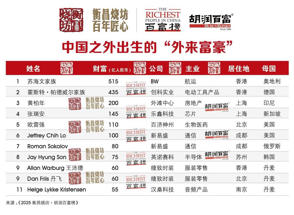 “今年榜单上有11位外国企业家,他们出生于海外,在中国发展。其中,首富是84岁的奥地利人苏海文,他是船王包玉刚的女婿,现坐拥超过500亿元人民币财富,居住于香港。白手起家类别中的首富,是同样居住在香港的80岁德国人霍斯特·帕德威尔。他所创立的电动工具与吸尘器企业创科实业,为其积累了逾400亿元的财富。在创造企业价值方面,57岁的美国人欧雷强表现最为突出。他创办的抗癌药企业百济神州,价值近3000亿元,进入胡润世界500强。尤为引人注目的是丹麦,这个国家共有三位企业家上榜。”