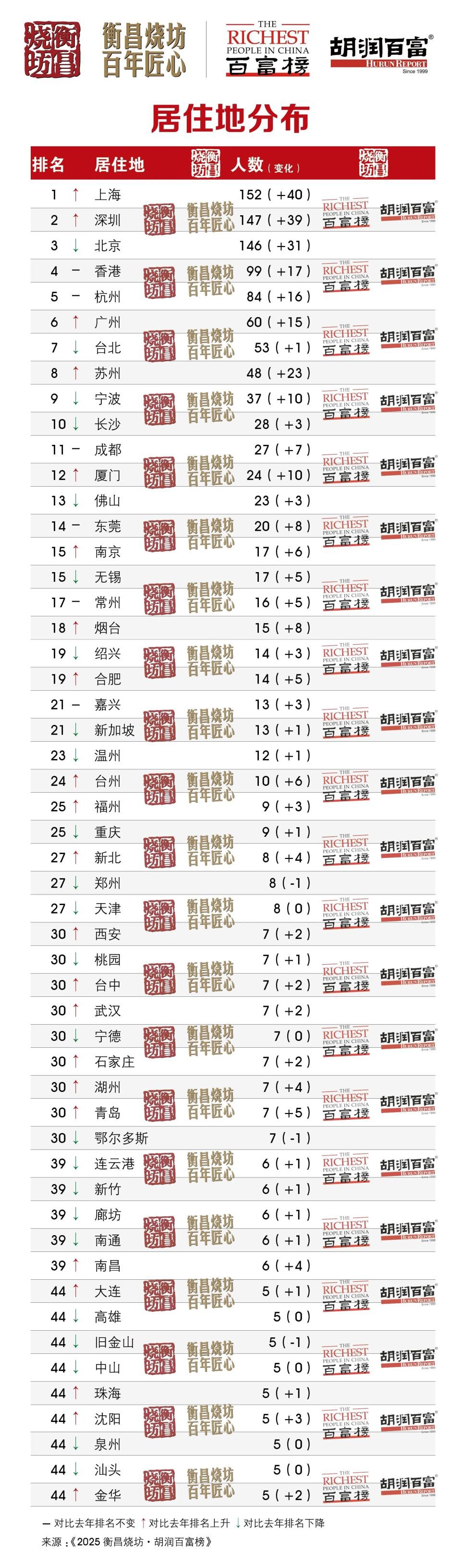 上榜企业家的居住地分布呈现“3+2+3”格局。上海、深圳、北京占据“企业家密度”前三名,其中北京时隔十多年首次被上海和深圳超越。上海以152位上榜者夺得第一,比去年增加40位。深圳以147位位列第二,比去年增加39位;北京以146位位列第三,比去年增加31位。香港(99位,+17位)、杭州(84位,+16位)分别位列第四、第五;广州(60位,+15位)超过台北升至第六,台北(53位,+1位)位列第七;苏州(48位,+23位)超过宁波升至第八。上海和深圳上榜人数增长最多,主要原因是A股回暖,且两地是半导体、生物医药、游戏、AI等行业的集聚地。