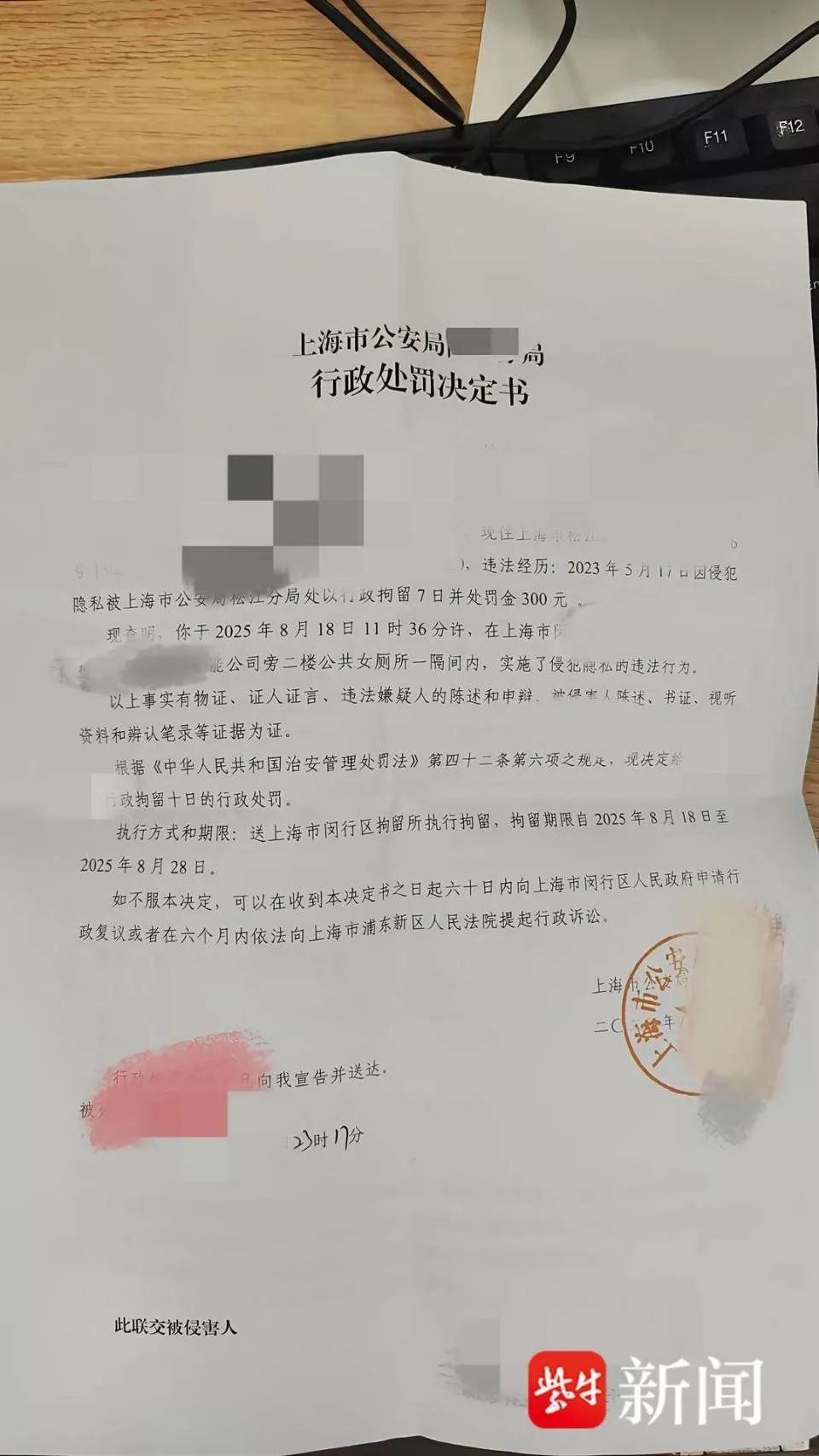 这次周女士直接选择了报警,“厕所门口的监控视频还显示,偷拍的男同事先是在女厕所外面徘徊观察了一下,看到附近没有人之后才进入。”后续警方对偷拍的男同事处以行政拘留10天的处罚。”据周女士向记者提供的警方行政处罚决定书显示,涉事男同事在公司旁二楼女厕所一个隔间内,实施了侵犯隐私的违法行为,现决定给予其行政拘留10日的行政处罚。
