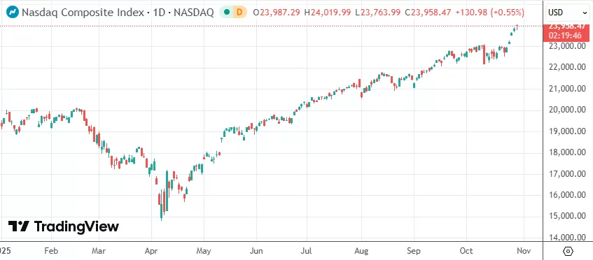 纳斯达克综合指数涨0.55%,报23958.47点,刷新了周二录得的收盘历史纪录,这也是该指数连续第四个交易日收于新高,盘中甚至一度涨破24000关口。