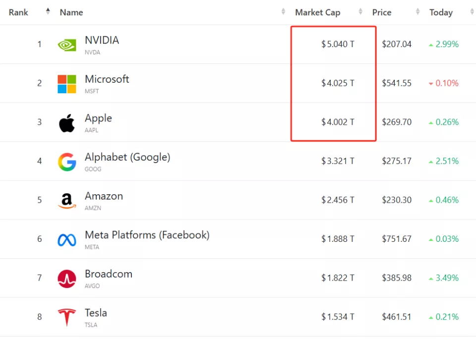 苹果涨0.26%报269.70美元也创新高,总市值为4.002万亿美元;微软跌0.10%,市值为4.025万亿美元——这意味着美股首次在收盘时出现三家市值超4万亿美元的公司。