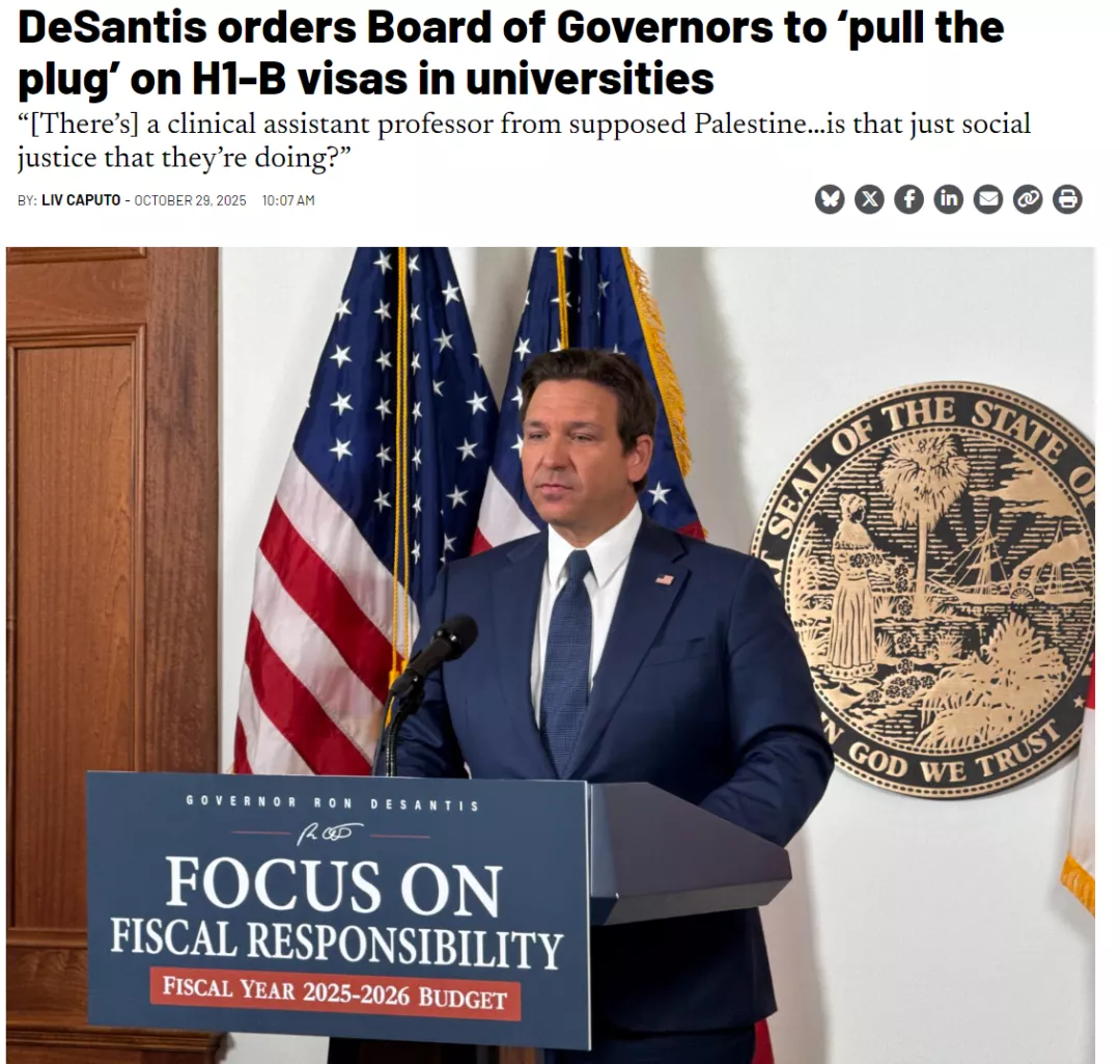 佛罗里达州州长罗恩·德桑蒂斯(Ron DeSantis)周三(10月29日)发布声明,要求全州各大学停止通过 H-1B