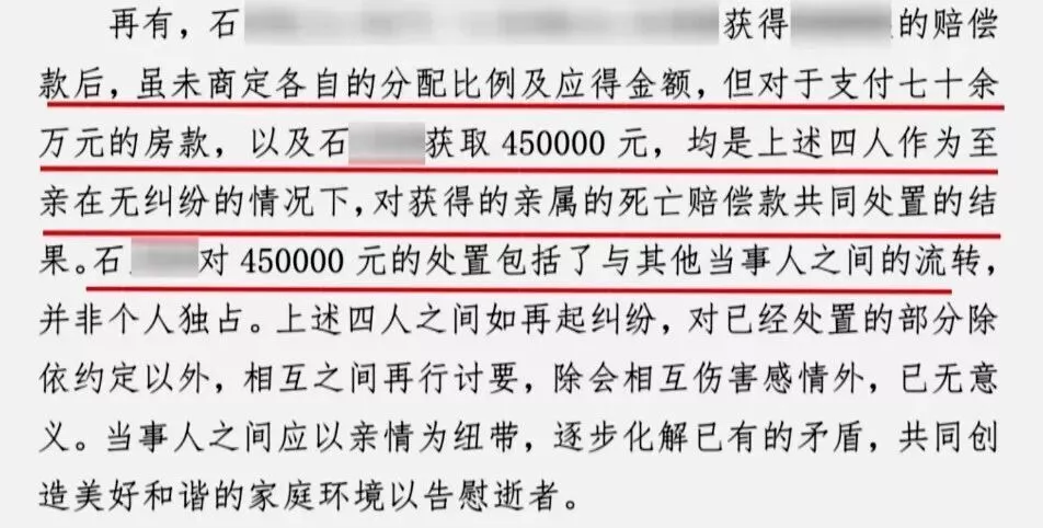终审法院认为,石先生一家虽然未商定各自的分配比例,但均是四个人作为至亲在无纠纷的情况下,对获得的亲属死亡赔偿款共同处置的结果。石先生女儿对450000元的处置包括了与其他当事人之间的流转,并非个人独占。