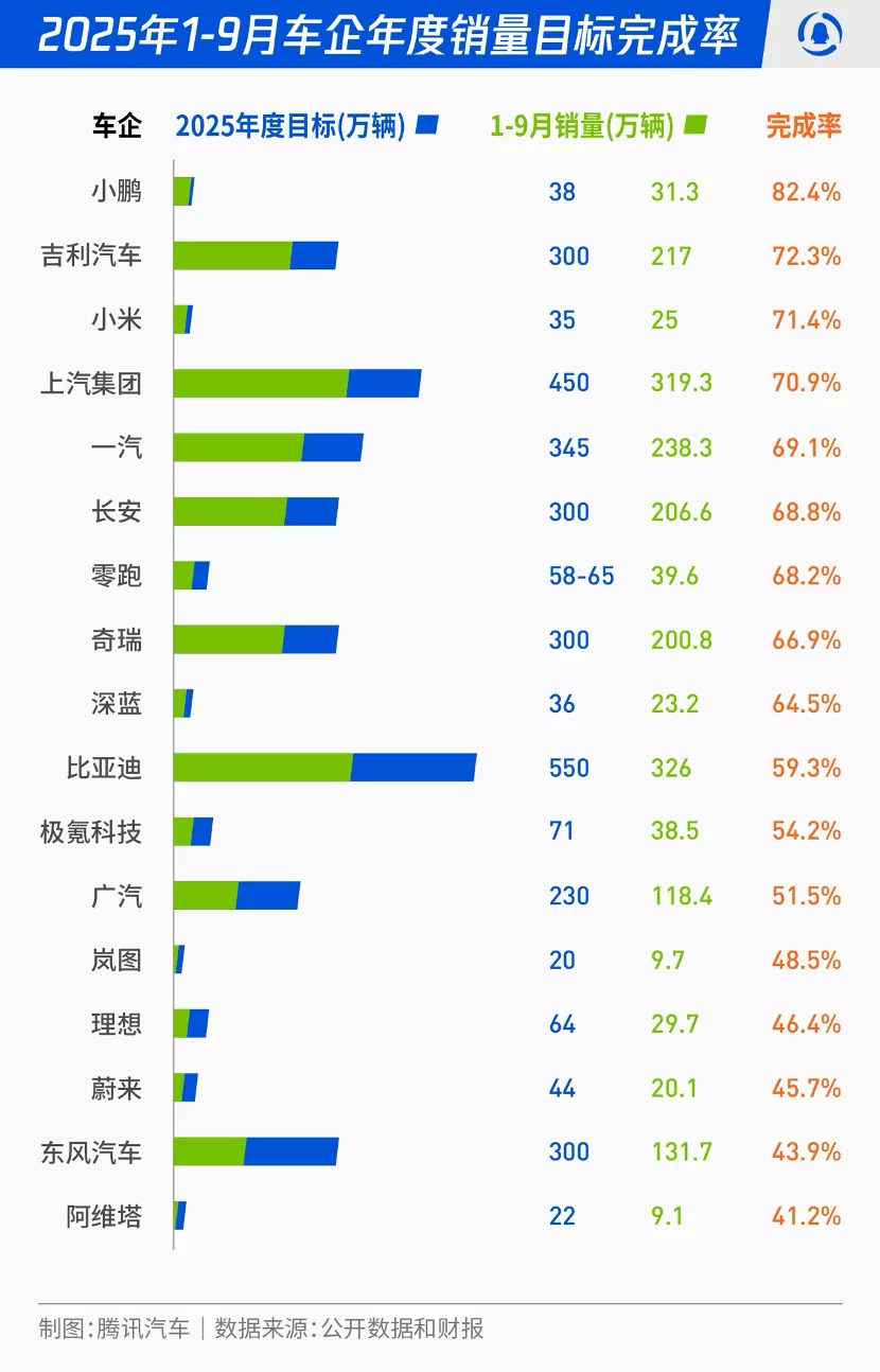 腾讯汽车《远光灯》统计了17家车企前三季度的目标销量完成情况,整体情况并不乐观,半数以上车企不可能完成年初设定的目标。