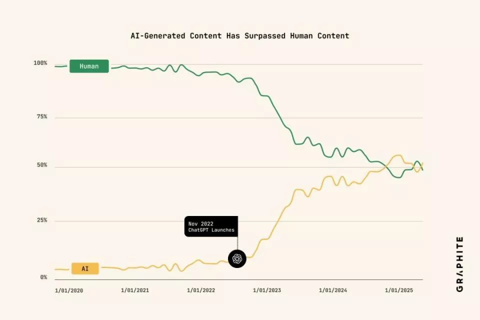 内容分析平台 Graphite 曾发布过一项数据,早在 2024 年 11 月,网络上 AI