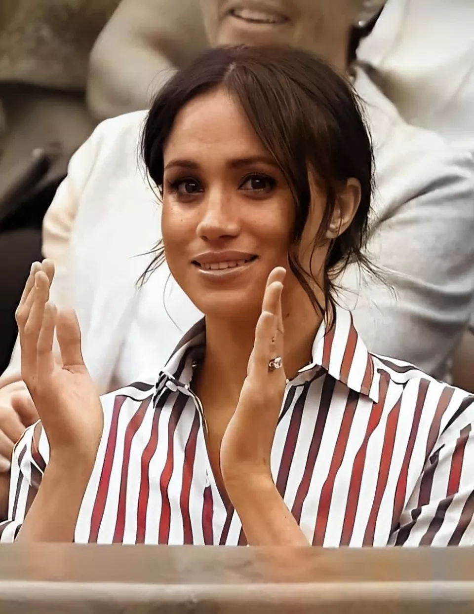 这个徽章是什么来头?它是一个字母“M”顶上戴着一个王冠。这是当年她与哈里王子大婚前,英女王伊丽莎白二世亲自赐予的,象征着她作为王室成员的身份。自从2020年她与哈里正式退出王室工作、移居美国加州后,理论上,她就不应再在商业活动中使用这个代表王室职权的符号了。