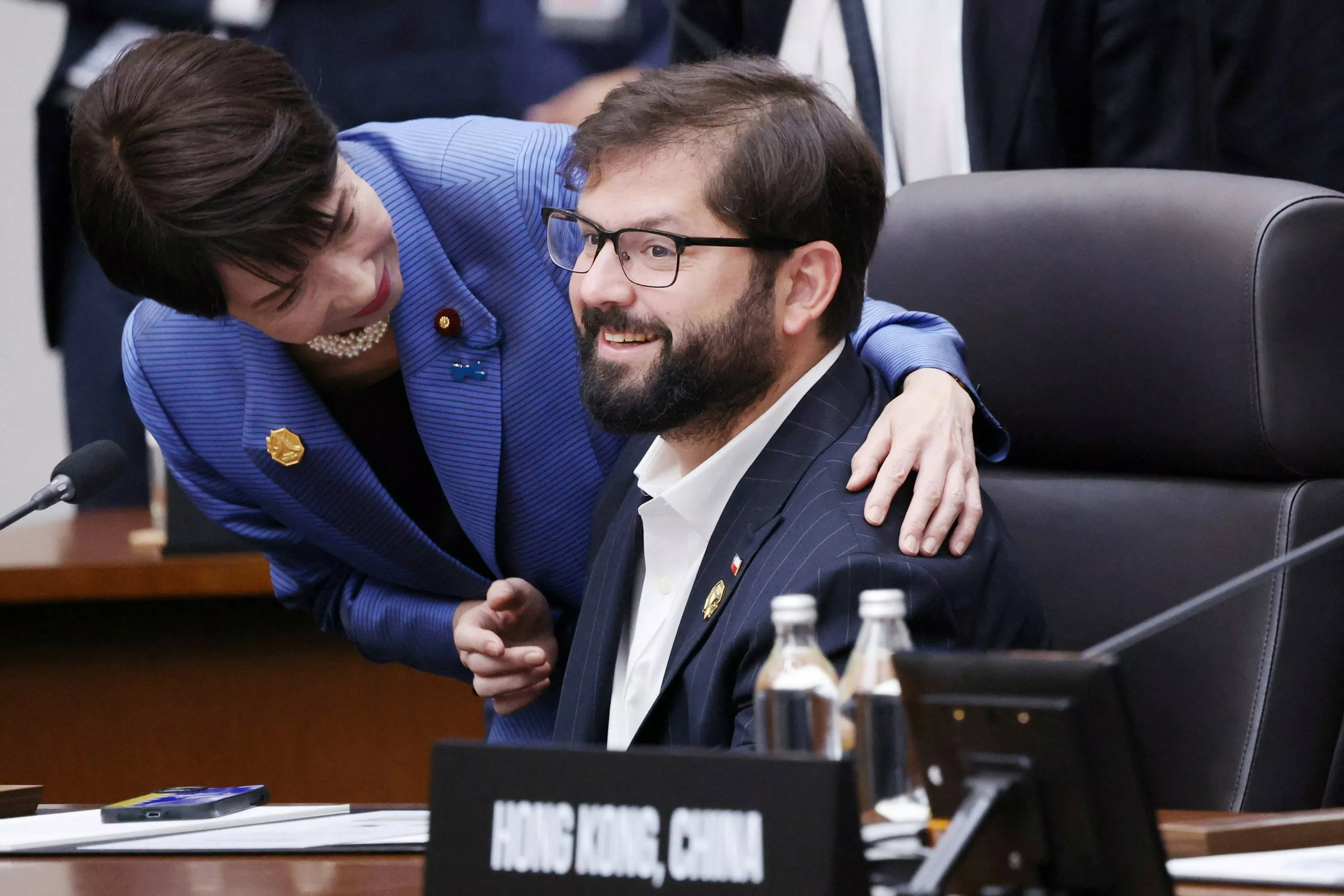 #APEC 首脳会議の会場で、#高市早苗首相 がチリのガブリエル.ボリッチ大統領と短く言葉を交わす場面が見られました。両首脳は笑顔で挨拶し、友好的な雰囲気が見られました。