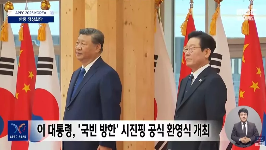 2025年11月1日,韩国庆州,图为中国国家主席习近平会晤韩国总统李在明。(截图自YouTube@MBCNEWS11)