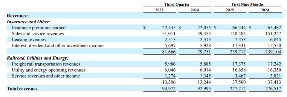三季报显示,伯克希尔第三季度总营收为949.72亿美元,同比增长2.13%,去年同期为929.95亿美元;净利润为307.96亿美元,同比增长17.31%,去年同期净利润为262.51亿美元。2025年前三个季度,伯克希尔累计实现营收2772.12亿美元,净利润477.69亿美元。