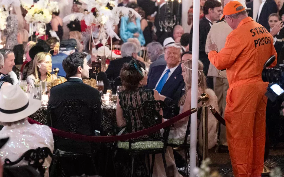 “当香槟美酒汩汩流淌、穿着弗拉帕舞女服装的舞者为宾客表演时,唐纳德·特朗普扮演起了盖茨比的角色。就在仅仅数小时后,约4200万美国人失去了食品援助。”