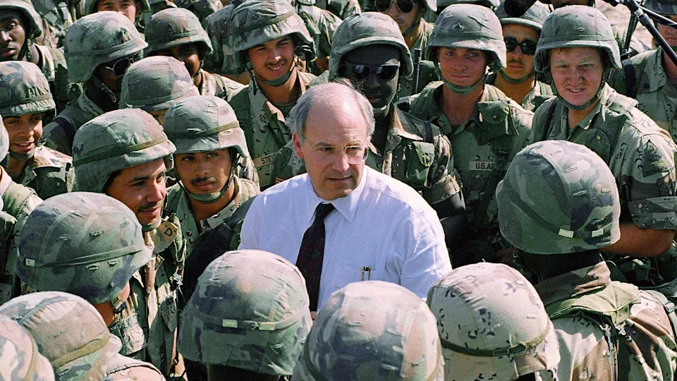 切尼于1991年海湾战争期间在伊拉克向美军部队发表演说。 [AP]