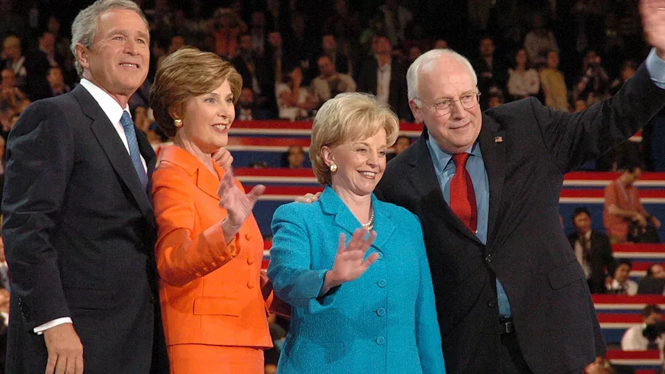 切尼(最右)与妻子琳恩出席 2004 年的共和党全国代表大会,与乔治·W·布什总统及其妻子萝拉一同现身。 [Getty]