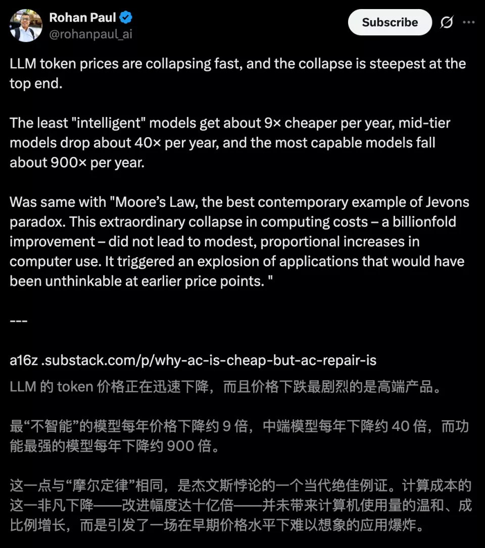 发帖人是Rohan Paul,一位长期追踪AI成本曲线的分析师。他总结得更直接:
