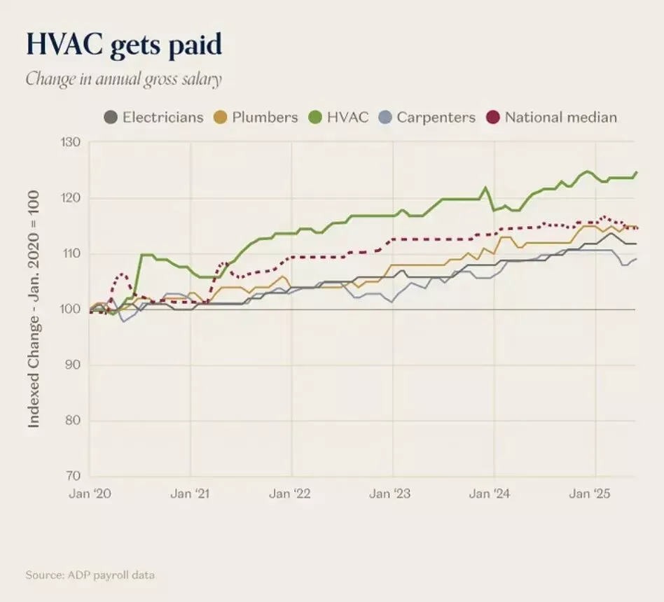 AI通缩时代的人类通胀:维修工的工资曲线。2020–2025年美国各类技术工种年薪变化,空调维修(HVAC)工资增速明显高于全国中位数。