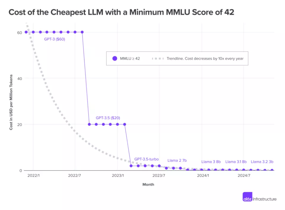 另一份来自a16z的分析也指出,LLM推理成本正以