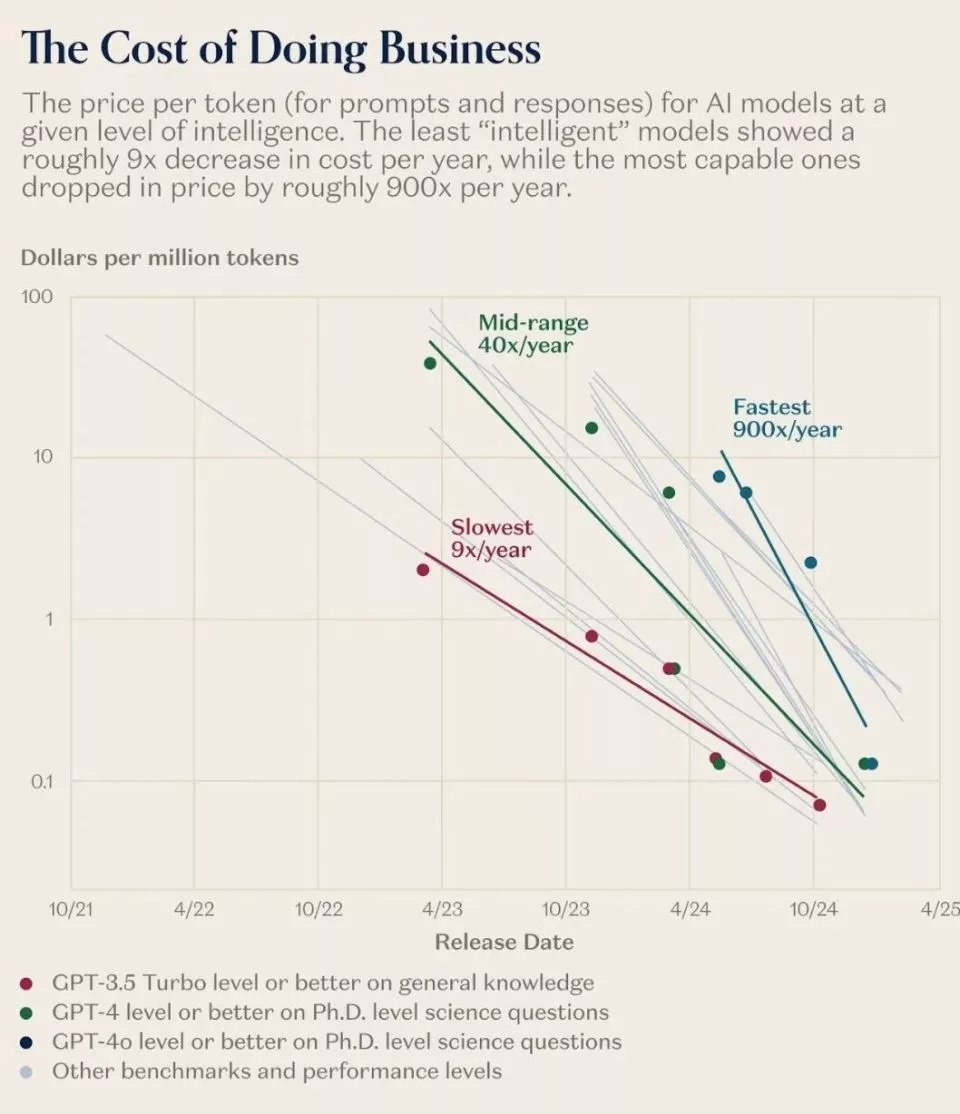 「LLM的token成本每年暴跌百倍,最高端的模型甚至以900倍的速度在坠落。」
