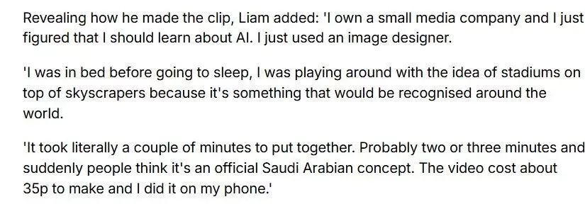 “制作这个视频真的只花了短短几分钟。大概两三分钟,突然间人们就以为这是沙特阿拉伯的官方宣传。制作这个视频的成本大约是35便士,而且我是用手机做的。”