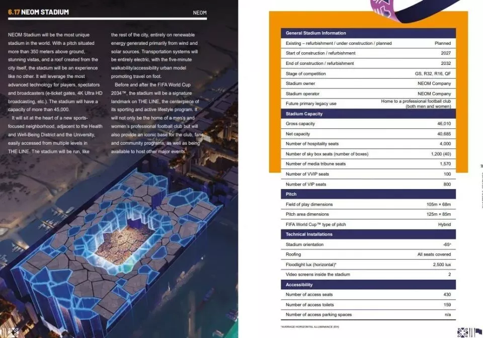 在沙特的2034年世界杯申办计划书中,“该球场将位于地面以上超过350米……该体育场的容量将超过45000人。该球场将与新未来城的其余地区一样,完全依靠由风能和太阳能产生的可再生能源。交通系统将全部采用电动模式,同时以步行可达的5分钟城市模型促进步行出行。”