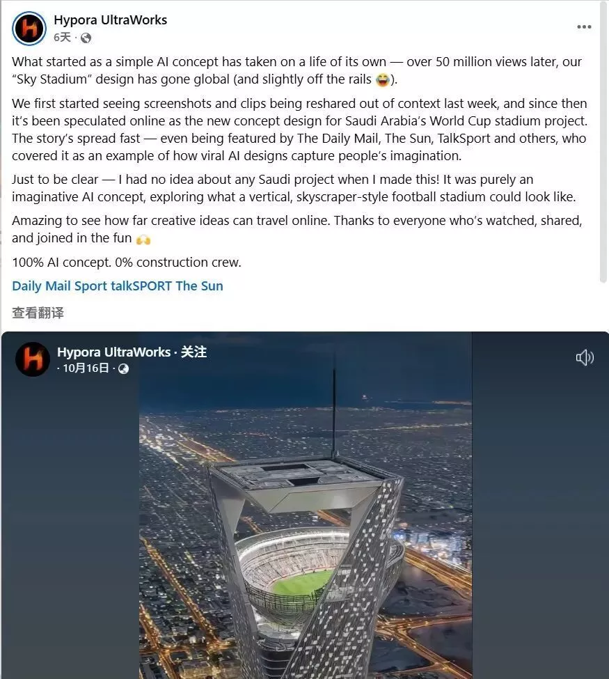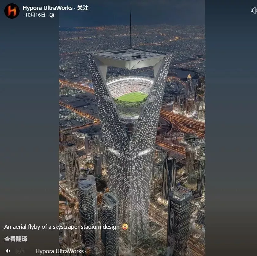 UltraWorks转发了这段原视频并指出,“当我做这个的时候,我完全不知道沙特阿拉伯的任何项目!这纯粹是想象的AI概念,探索垂直摩天大楼风格的足球场可以看起来像什么。”