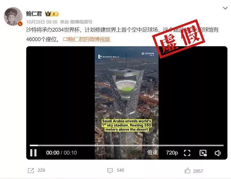 网传“沙特空中足球场”画面实际是由一个设计AI视频的账号发布的,发布者原视频配文中完全没有提及沙特,网传说法为后续社交平台传播过程中产生的误导。