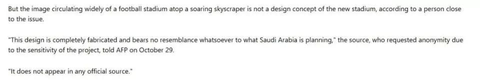 综上所述,网传“沙特空中足球场”画面实际是由一个设计AI视频的账号发布的,发布者原视频配文中完全没有提及沙特,网传说法为后续社交平台传播过程中产生的误导。作为2034年世界杯的主办国,沙特阿拉伯确实有一个建造空中球场的设想。不过其申办计划书中的概念图与网传视频有较大差别,该项目相关人士也表示,网传画面与沙特的项目计划没有关系。