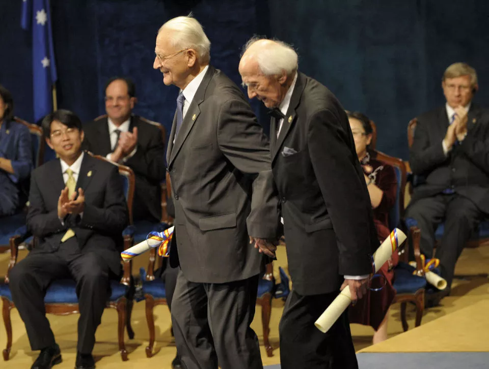 2010年10月22日,阿斯图里亚斯亲王奖颁奖典礼在西班牙奥维耶多举行,齐格蒙特.鲍曼(右)和法国社会学家阿兰.图海纳在领取交流与人文奖后手拉着手走向台前