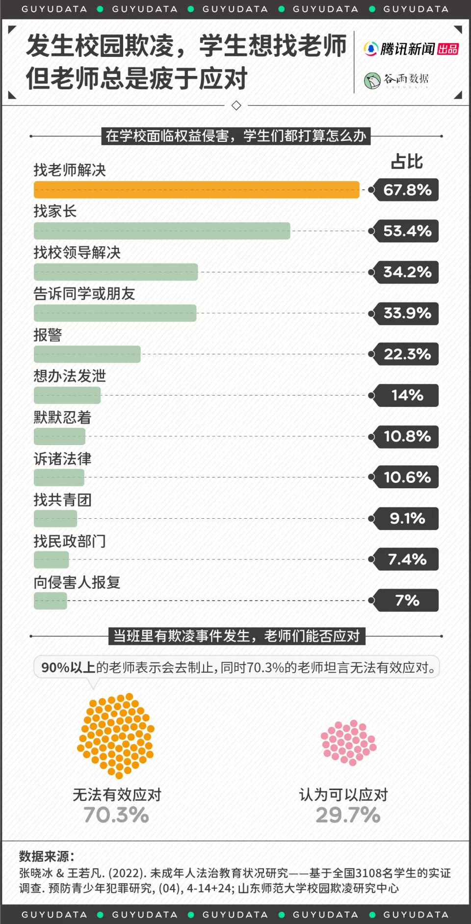 调研显示,当校园权益被侵害,67.8%的学生会选择找老师解决,53.4%会找家长,34.2%找校领导解决。然而老师那边的调研数据有些无奈:九成受访老师表示看见了会去管,但七成老师认为效果有限,无法有效应对欺凌的出现与蔓延。