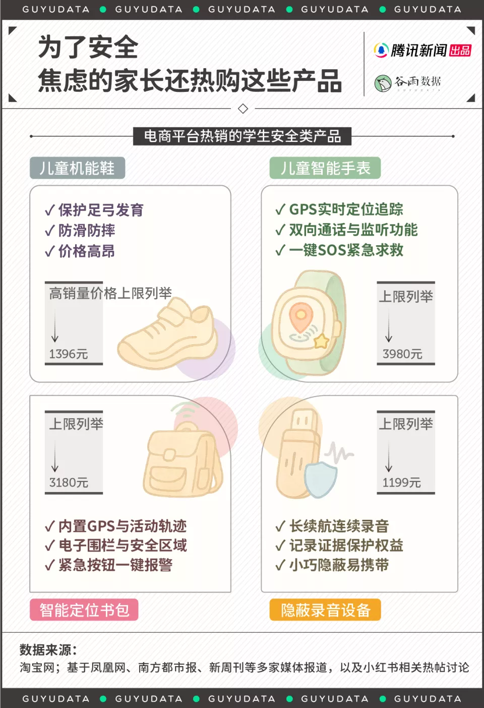 这些产品的共同特点是:贵。儿童智能手表中的高端款接近三四千,标配GPS实时定位、双向通话、一键SOS求救;还有内置GPS实时定位的智能书包,售价也可以达数千元,号称能设置“电子围栏”实时监控孩子动向;售价过千的隐蔽录音设备,“长续航连续录音,保护孩子权益”。家长们的购物车里,装的都是对孩子安全的焦虑。