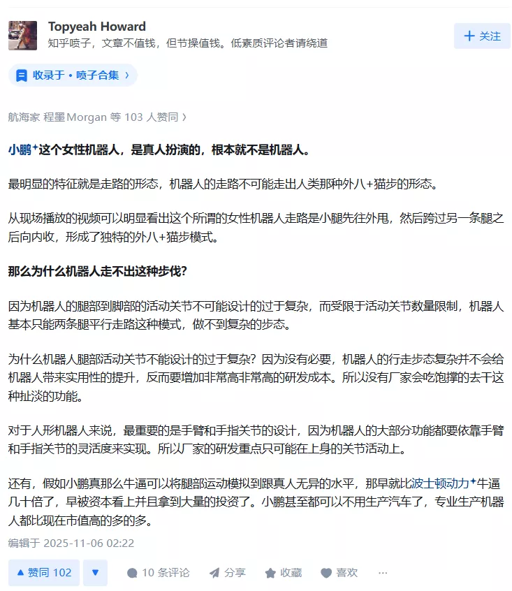 有人质疑,小鹏这个女性机器人,是真人扮演的,根本就不是机器人。