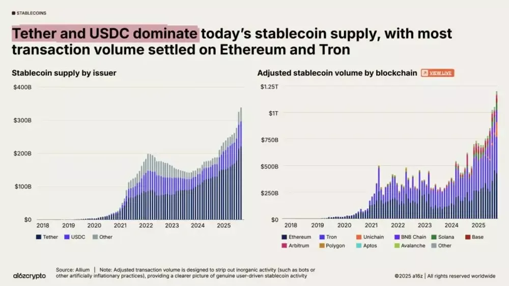 最新数据显示,在 2025 年初,Tron 和 Ethereum 两条链合计就约占 USDT 总流通量的 90%。其中 Tron 约