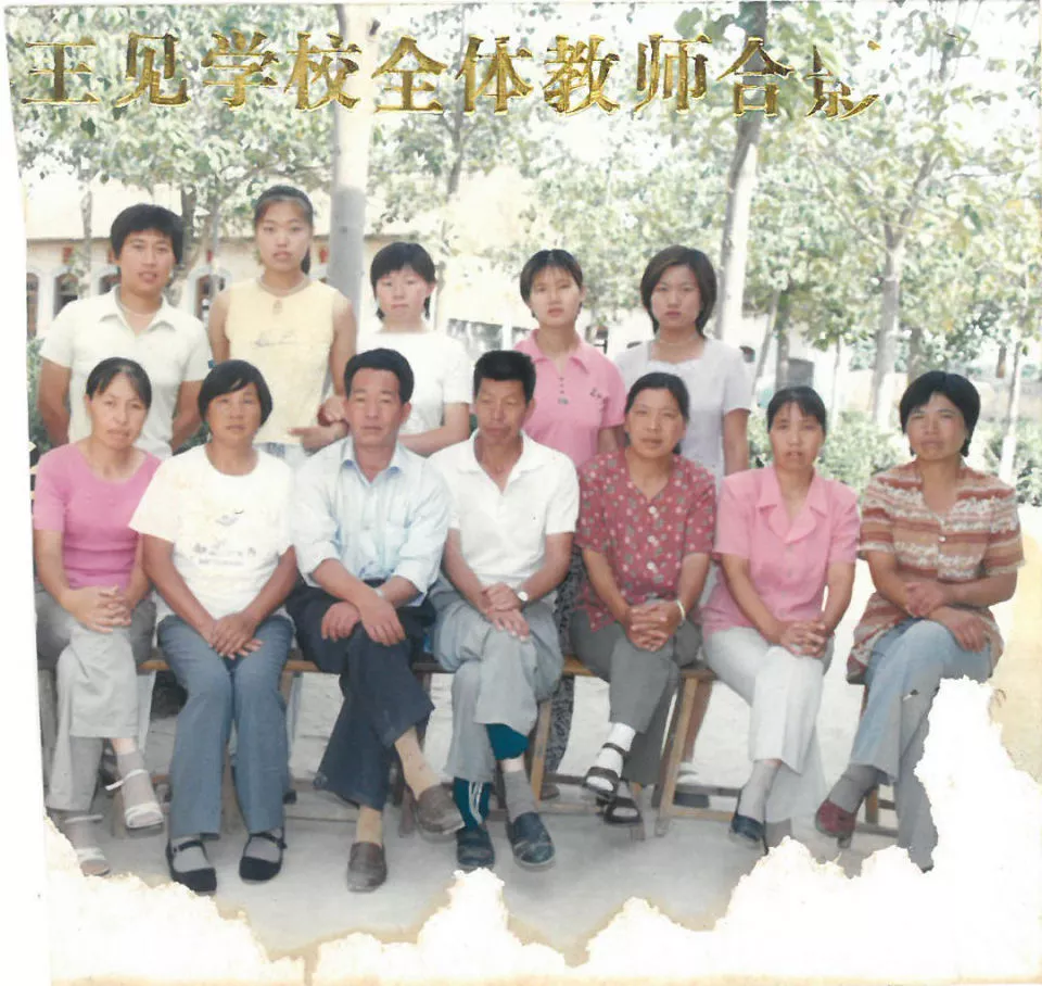 王见村学校教职工合影,后排右一为路亚丽。受访者供图