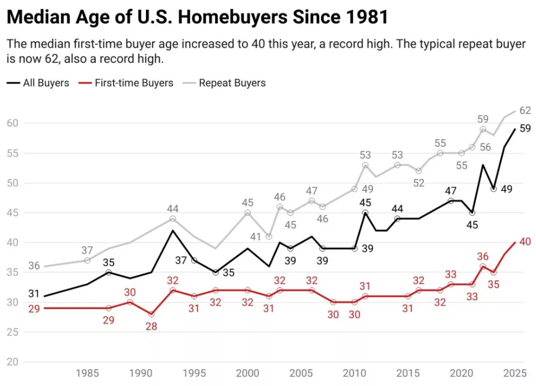 同时,美国买房者的整体中位年龄也上升至 59岁,远高于去年的56岁,这一变化凸显了财富与资产积累的代际分化。