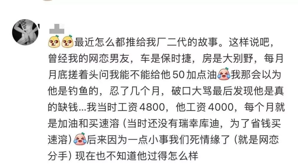 有网友谈了个厂二代对象,一度怀疑是谈到杀猪盘了。
