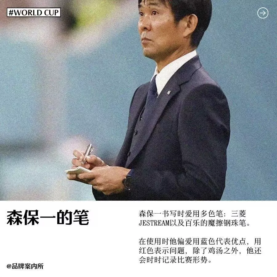 日本教练森保一每逢比赛调度,就会拿起笔本站在场边写写画画,所以他的文具袋也引发外界好奇,成为了互联网的流行文化,在森保一文具袋里也有JETSTREAM的身影,因此在当时也引发了消费热潮,我们在那年的《品牌案内所》系列中也做了介绍。