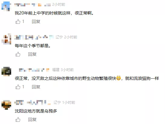 另据钱江视频,此前已有网友发视频称,沈阳火车站附近乌鸦成群,引发不少网友关注讨论。其中评论区有不少本地网友表示,冬天乌鸦成群结队是沈阳特色,属于“老朋友”了。不过,也有网友担心成群的乌鸦影响高铁安全通行。
