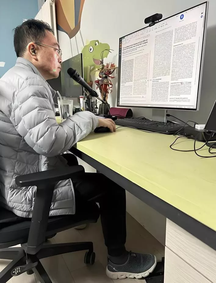 到2022年底,他只剩右手食指还能动。2023年,十指全部“罢工”。办公得用脚掌操控鼠标,后来用语音输入,再后来只能用“眼动仪”。即便如此,他仍每天工作超过十六个小时。